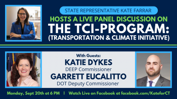 September 16, 2021Climate change is here. Next Monday, September 20 at 6 p.m., please join me, Connecticut Department of Energy and Environmental Protection Commissioner Katie Dykes and Connecticut Department of Transportation Deputy Commissioner Garrett Eucalitto for a discussion on the Transportation & Climate Initiative Program (TCI).