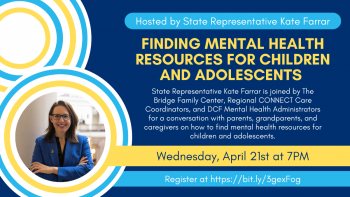 April 16, 2021Do you know a young person who may be struggling with their mental health? On Wednesday, April 21 at 7 p.m., I will be joining the Bridge Family Center, Regional CONNECT Care Coordinators, and DCF Mental Health Administrators for a conversation with parents, grandparents, and caregivers on how to find mental health resources for children and adolescents.