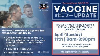 April 9, 2021This Sunday, April 11 from 8 a.m. to 3:30 p.m., the state Department of Veterans Affairs will hold a COVID-19 Vaccine Walk-In Clinic at 287 West Street, Rocky Hill. During this clinic, anyone who served in the U.S. armed services, regardless of their enrollment in the VA healthcare system, spouses and caregivers of veterans will be able to receive the COVID-19 vaccine. No appointment is necessary.