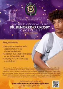 March 26, 2025The Hartford Chapter of the Omega Psi Phi Fraternity is now accepting applications for the Dr. Denorris D. Crosby Scholarship. The purpose of this $2,500 award is to support Black male high school seniors in the Greater Hartford Area that are pursuing higher education.