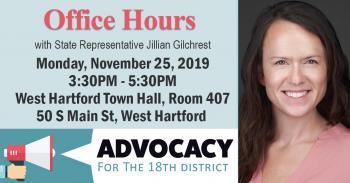 November 15, 2019I will be holding office hours Monday, November 25 from 3:30 p.m. to 5:30 p.m. in Room 407 of the West Hartford Town Hall, 50 S. Main St.