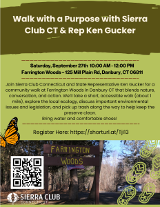 September 17, 2025As a reminder, Sierra Club Connecticut and I will hold a community walk at Farrington Woods in Danbury on Sunday, September 27. We’ll take a short, accessible walk (about 1 mile), explore the local ecology, discuss important environmental issues and legislation, and pick up trash along the way to help keep the preserve clean.