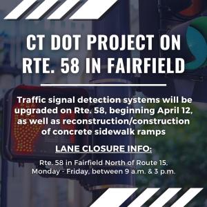 April 8, 2024The CT Department of Transportation has announced a plan to upgrade traffic signal detection systems & construction or reconstruction of concrete sidewalk ramps, including Route 58 in Fairfield, beginning on April 12.