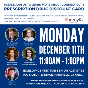 December 1, 2023Join me and the Fairfield delegation, as we welcome special guest, Comptroller Sean Scanlon, as we discuss the state's new prescription drug discount card, ArrayRx. Over 12,000 residents of Connecticut have already signed up for the discount card.