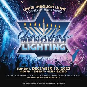 December 11, 2023TIME CORRECTION! Due to Sunday's storm, the menorah lighting, hosted by Chabad of Fairfield, will take place December 11 at 6 p.m. at the Sherman Green Gazebo.
