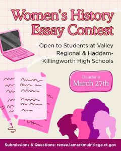 February 24, 2026Students of Valley Regional & Haddam-Killingworth High Schools - March is Women's History Month & I'd like to invite you to take part in an essay contest!