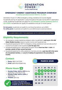 March 4, 2026The Generation Power CT (GPCT) Emergency Energy Assistance Program is currently open for the final cycle this season. The application cycle will run through Tuesday, March 10th. This program provides a one-time grant of up to $500 to help eligible Connecticut households with electric, gas, or fuel expenses.
