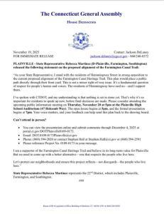 November 19, 2025This morning, I released the following statement on the proposed alignment of the Farmington Canal Trail