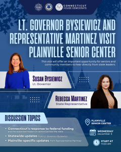December 1, 2025A reminder to please join me and Lt. Gov. Susan Bysiewicz for a visit to the Plainville Senior Center (200 East St., Plainville) this Wednesday, Dec. 3 at 11am to discuss Connecticut's response to federal funding, statewide updates, and Plainville-specific updates.