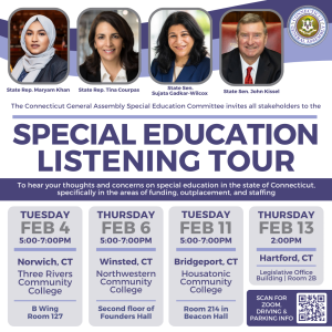 February 12, 2025Happy Wednesday! On Thursday, Feb. 13 at 2pm via Zoom or in Room 2B of the Legislative Office Building (300 Capitol Ave, Hartford), the Chairs and Ranking Members of the Select Committee on Special Education will hold a listening session to hear from parents, teachers, students, Boards of Education, school administrators and community members on issues impacting special education services across the state.