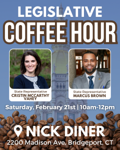 February 20, 2026A reminder to please join me and State Rep. Marcus Brown for our legislative coffee hour tomorrow, Feb. 21 from 10am-noon at Nick Diner (2200 Madison Ave., Bridgeport).