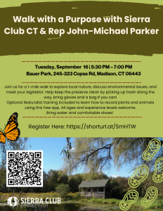 On Tuesday, September 16 from 5:30-7pm at Baur Farm (245-323 Copse Rd., Madison), I will be joining the Sierra Club for a "Walk with a Purpose" event. We will be discussing some of the major environmental legislation I've been working on as House Chair of the Environment Committee, exploring local nature, and even giving back to our planet by picking up trash along the way!