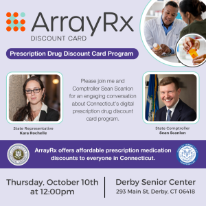 October 4, 2024Please join me for an information session on the ArrayRx Discount Card with Comptroller Sean Scanlon on Thursday, October 10 at noon at the Derby Senior Center. Comptroller Scanlon and I will discuss the benefits of the ArrayRx program, which negotiates discounts with pharmacy networks and rebates with drug manufacturers to make many common drugs available at a fraction of the price.