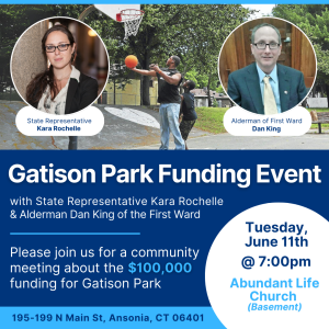 June 10, 2024Please join Alderman Dan King of the First Ward and I if you want to learn more about the $100,000 of federal funding we will be getting for improvements for Gatison Park. We will discuss the funding in the basement of the Abundant Life Church on June 11 at 7 pm.