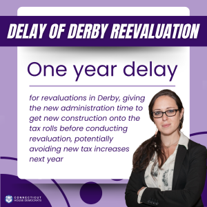 May 9, 2024I have some big news for our district! I and the Derby state delegation, in collaboration with Mayor Joe DiMartino, have been able to secure a one year, state-approved delay for revaluations in Derby, giving the new city administration time to get new construction onto the tax rolls before conducting revaluation.
