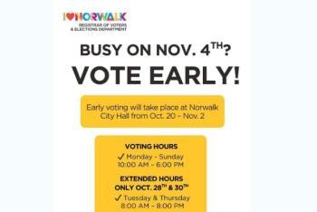 October 24, 2025Early voting has started, and will end Sunday, Nov. 2. Hours are daily (Sunday through Saturday) from 10 a.m. to 6 p.m., except on Tuesday, Oct. 28, and Thursday, Oct. 30, which have extended hours from 8 a.m. to 8 p.m. Same-day registration will be available during early voting hours and on Election Day. The early voting location in Norwalk is City Hall, located at 125 East Ave. Absentee Ballots must be received by 8 p.m., before closing on Nov. 4, Election Day. Please mail your ballot early so it's received before polls close on Nov. 4.