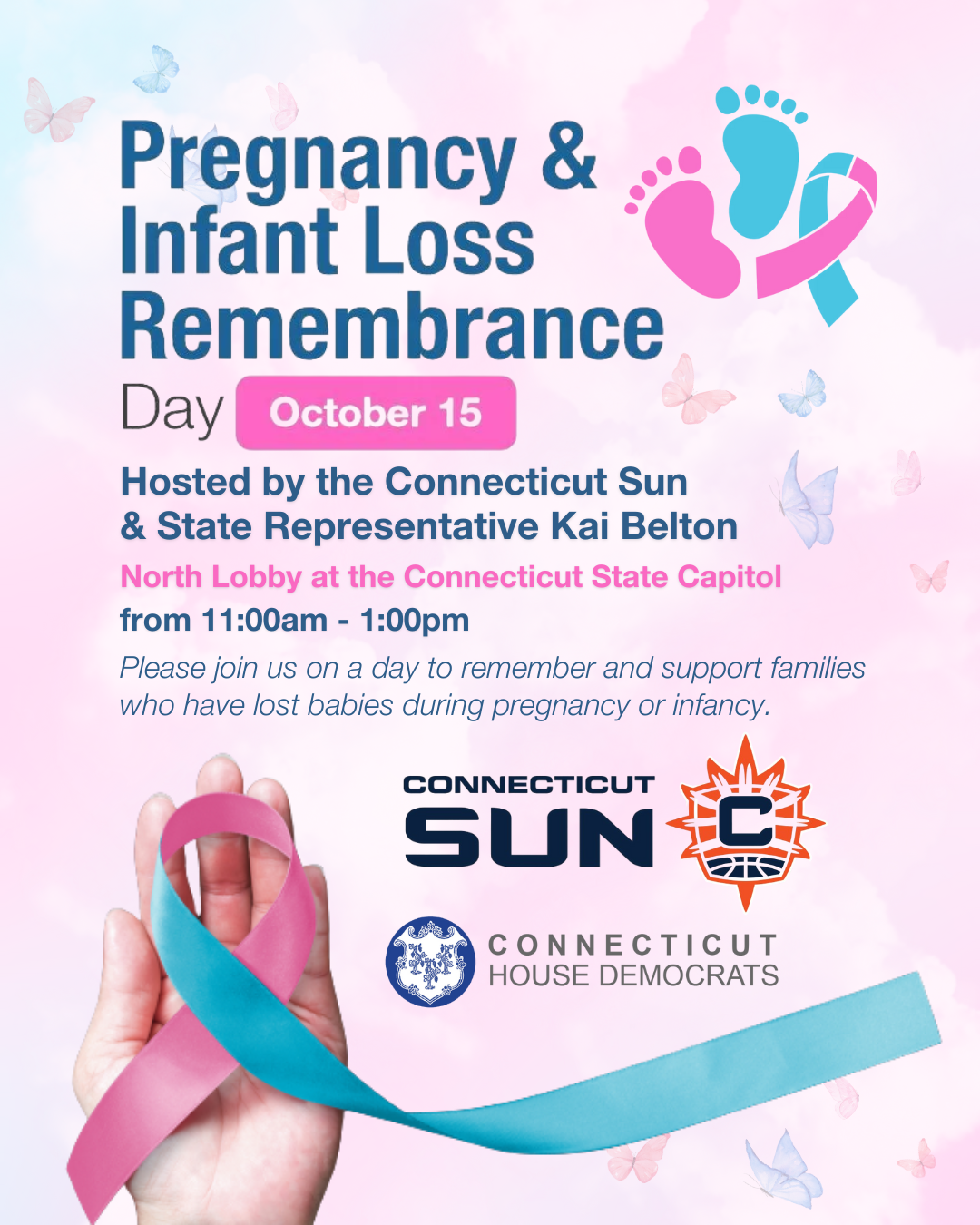 A friendly reminder: You're invited to join me and the Connecticut Sun for Pregnancy & Infant Loss Remembrance Day tomorrow, October 15th, from 11 a.m. to 1 p.m. in the North Lobby of the Capitol.