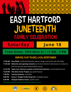 June 6, 2022The Town of East Hartford in collaboration with East Hartford Parks and Recreation, the Commission on Culture and Fine Arts, East Hartford Public Library and the East Hartford Black Caucus invites you to attend the town’s first Juneteenth Celebration.