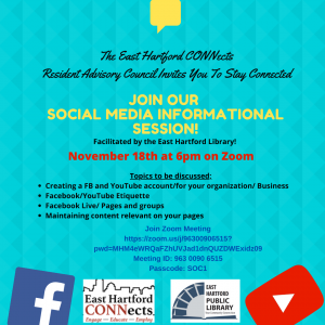 November 18, 2020The RAC will host a zoom Social Media Informational Session in collaboration with the East Hartford Library TONIGHT at 6pm.