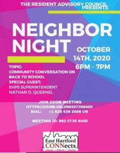 October 14, 2020The Resident Advisory Council is hosting a Neighbor Zoom Night tonight at 6 pm. East Hartford Public School Superintendent Nathan D. Quesnel will join the discussion as a special guest.