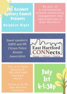 July 8, 2020The Resident Advisory Council, will host a Neighbor Night on July 1 at 4pm. The East Hartford Police Department and the EH Citizen Police Alumni Association will participate as guest speakers.