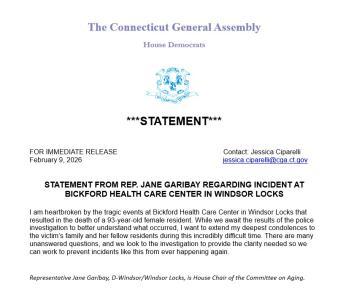 February 9, 2026Representative Garibay issued a statement following the news that a resident at Bickford Health Care Center died early Sunday morning, February 8. Police identified the resident as Margaret "Peggy" Healey, 93, who was found unresponsive outside the facility. Windsor Locks Police Department is conducting the investigation.