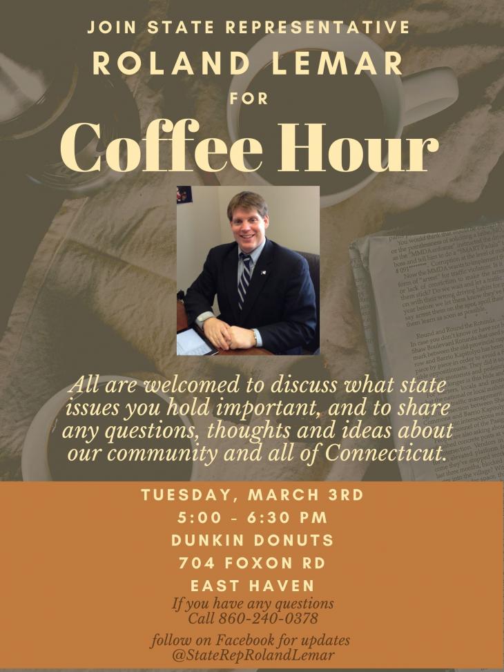 Please join me next Tuesday, March 3, for a coffee hour event in East Haven. I will be available to meet with constituents from 5:00pm to 6:30pm at Dunkin Donuts - 704 Foxon Road.