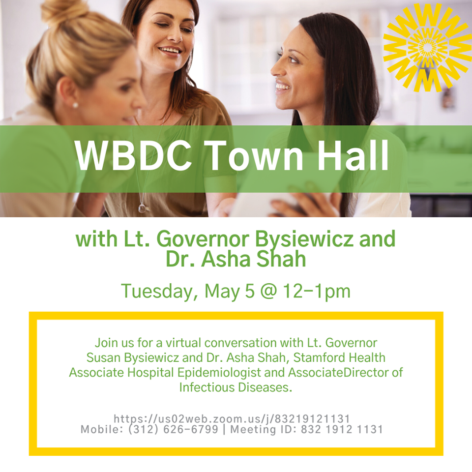 May 5 from 12 p.m. to 1 p.m., join the Women's Business Development Council, Lt. Governor Susan Bysiewicz, Dr. Asha Shah, Stamford Health Associate Hospital Epidemiologist and Associate Director of Infectious Diseases, for a zoom conversation on the COVID-19 response and update.